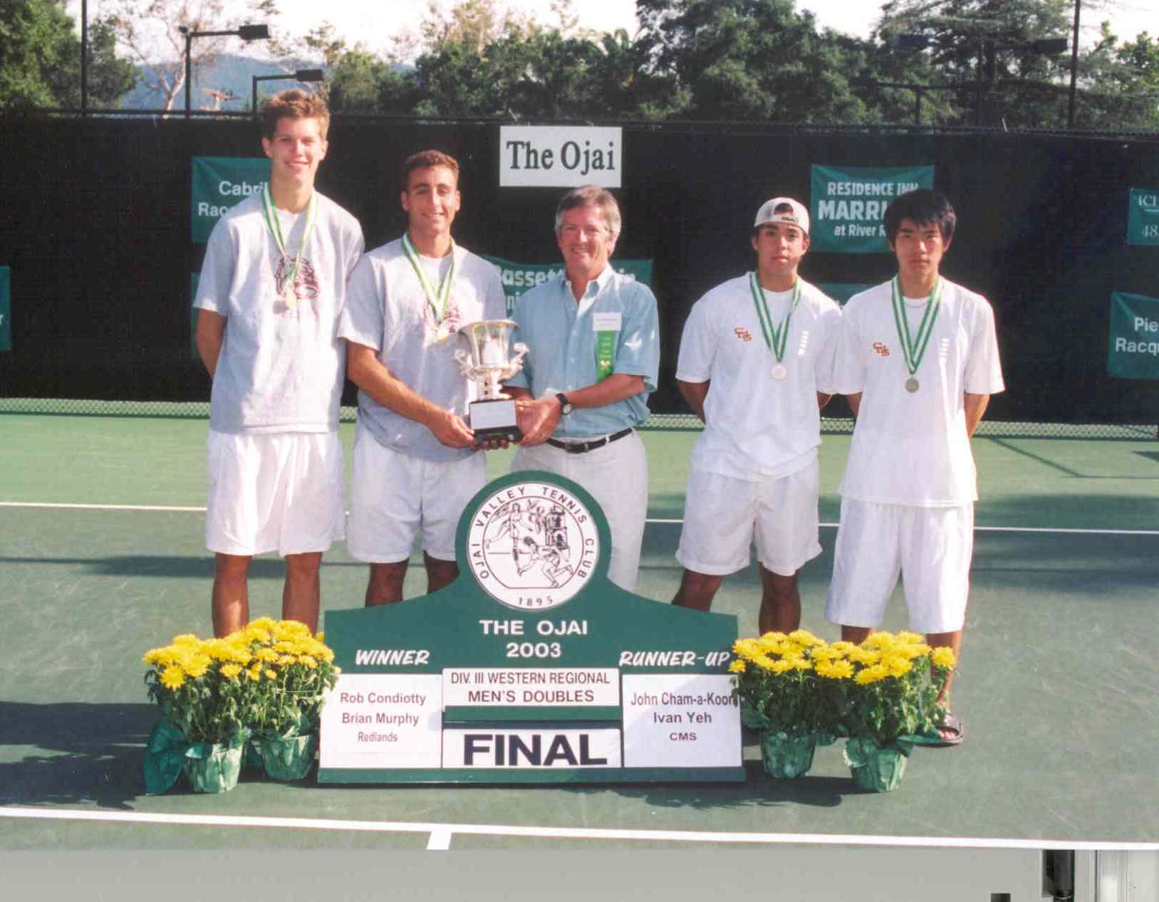 Men’s Division III West Regionals doubles: Rob Condiotty-Brian Murphy (Redlands) def. John Cham-a-koon-Ivan Yeh (Claremont-Mudd-Scripps)