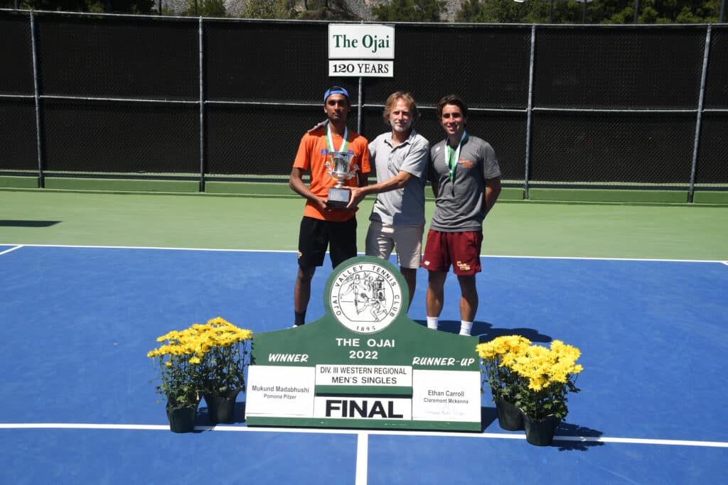 Men’s Division III West Singles: (1) Mukund Madabhushi (Pomona-Pitzer) d. (5) Ethan Carroll (Claremont-Mudd-Scripps) 4-6, 6-1, 6-4