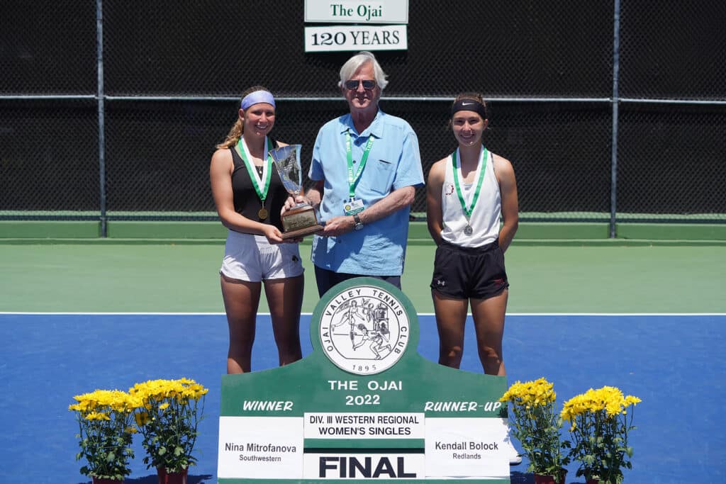 Women’s Division III West Singles: (1) Nina Mitrofanova (Southwestern University, TX) d. (8) Kendall Bolock (Redlands), 7-6 (7-5), 6-4