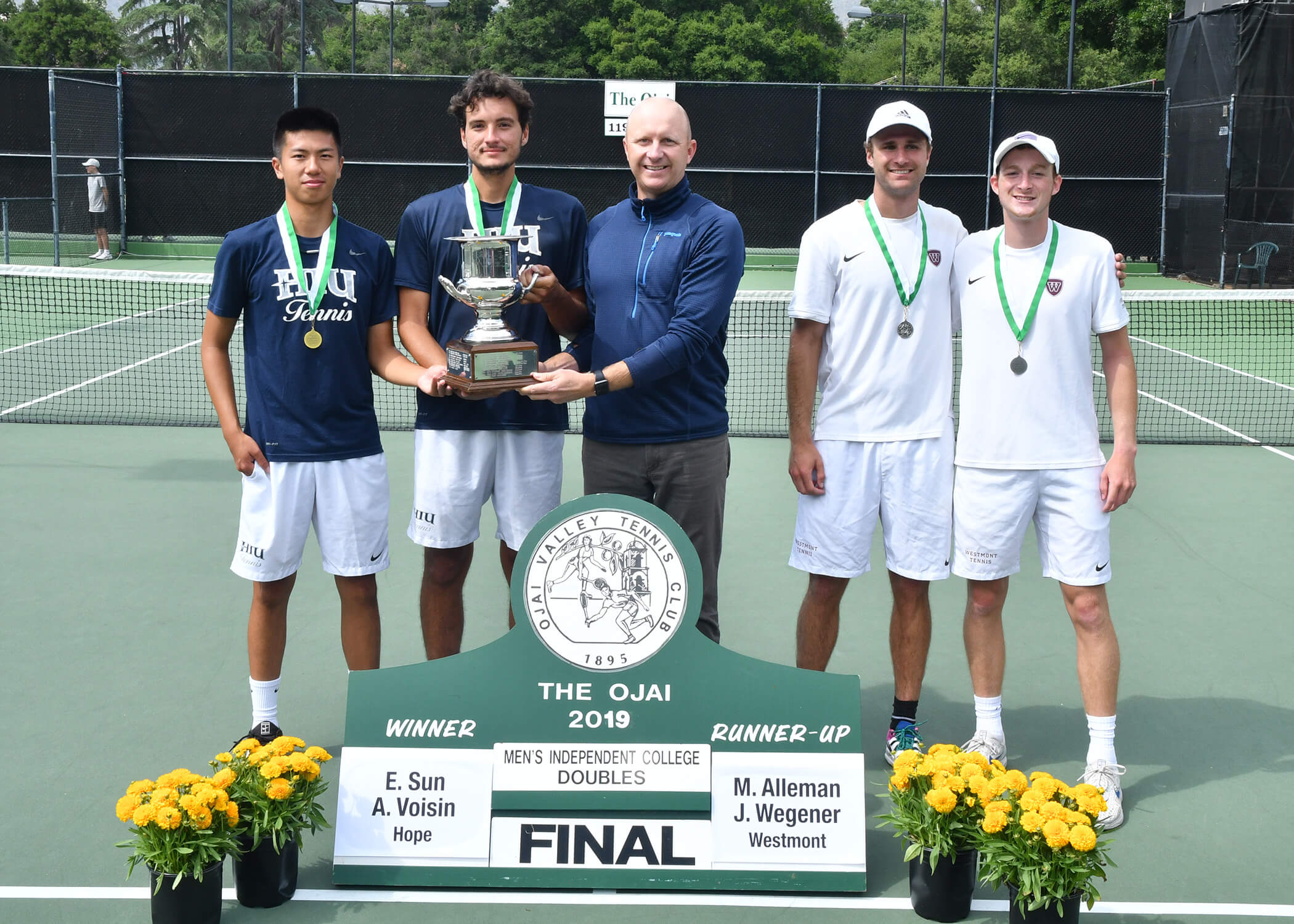 Men’s Independent College Doubles: (1) Eason Sun/Antoine Voisin (Hope International) d. (3) Matthew Alleman/Jason Wegener (Westmont), 6-3, 6-1