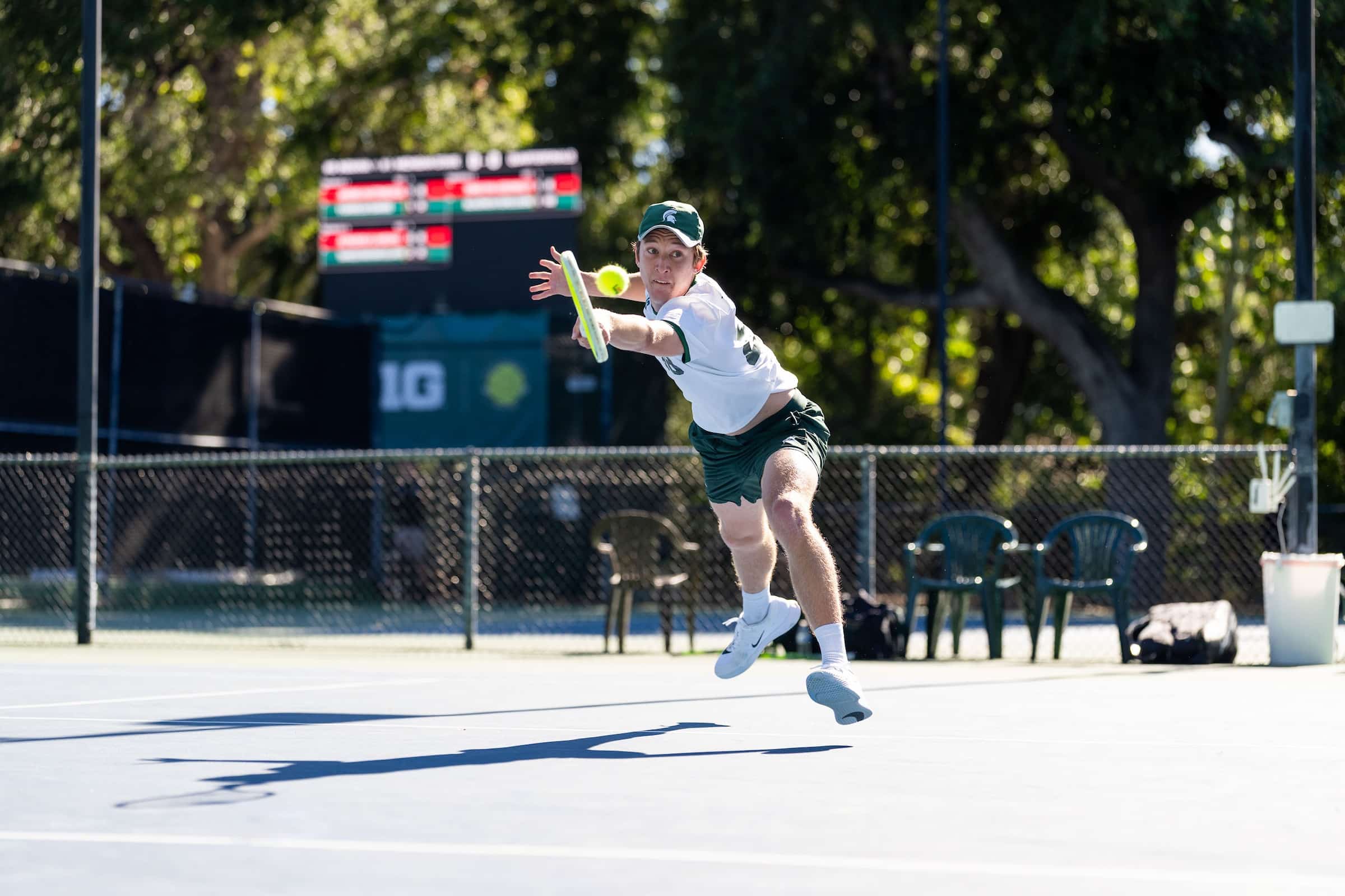 Big Ten regular season co-champion and No. 1 seed Michigan State (No. 25) rolled over Indiana, 4-1, behind singles victories from the Spartans’ NCAA All American tandem, sophomore Matthew Forbes and senior Ozan Baris (who also teamed in doubles to win a set and pace Michigan State to the doubles point), and sophomore Mitchell Sheldon, who won the Big Ten’s individual championships in November.